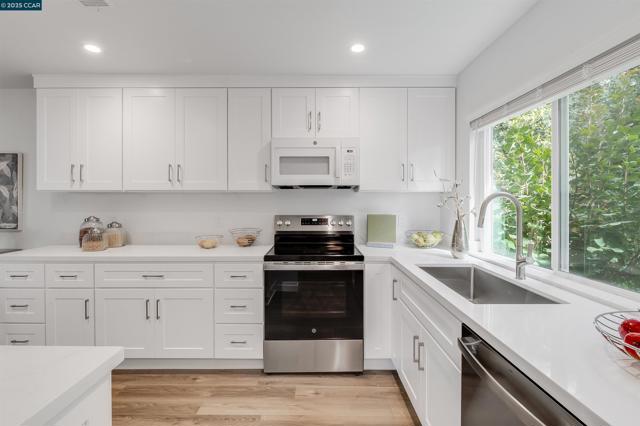 Bright Corner Townhome in Prime Concord Location! Welcome to this spacious and stylish 3-bdr, 2.5-bth corner unit in the desirable Cowell Terrace community. Step inside to a dramatic entry with tall ceilings and an elegant staircase that sets the tone for this light-filled home. The remodeled kitchen features granite countertops, stainless steel appliances, and an electric stove.